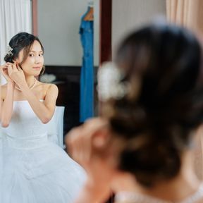 挙式はアップスタイル、披露宴はハーフアップにしました。アップは緩い編み込みを下の方でまとめて、ハーフアップは全体を巻いた後、トップ部分を編み込みにしてもらいました。