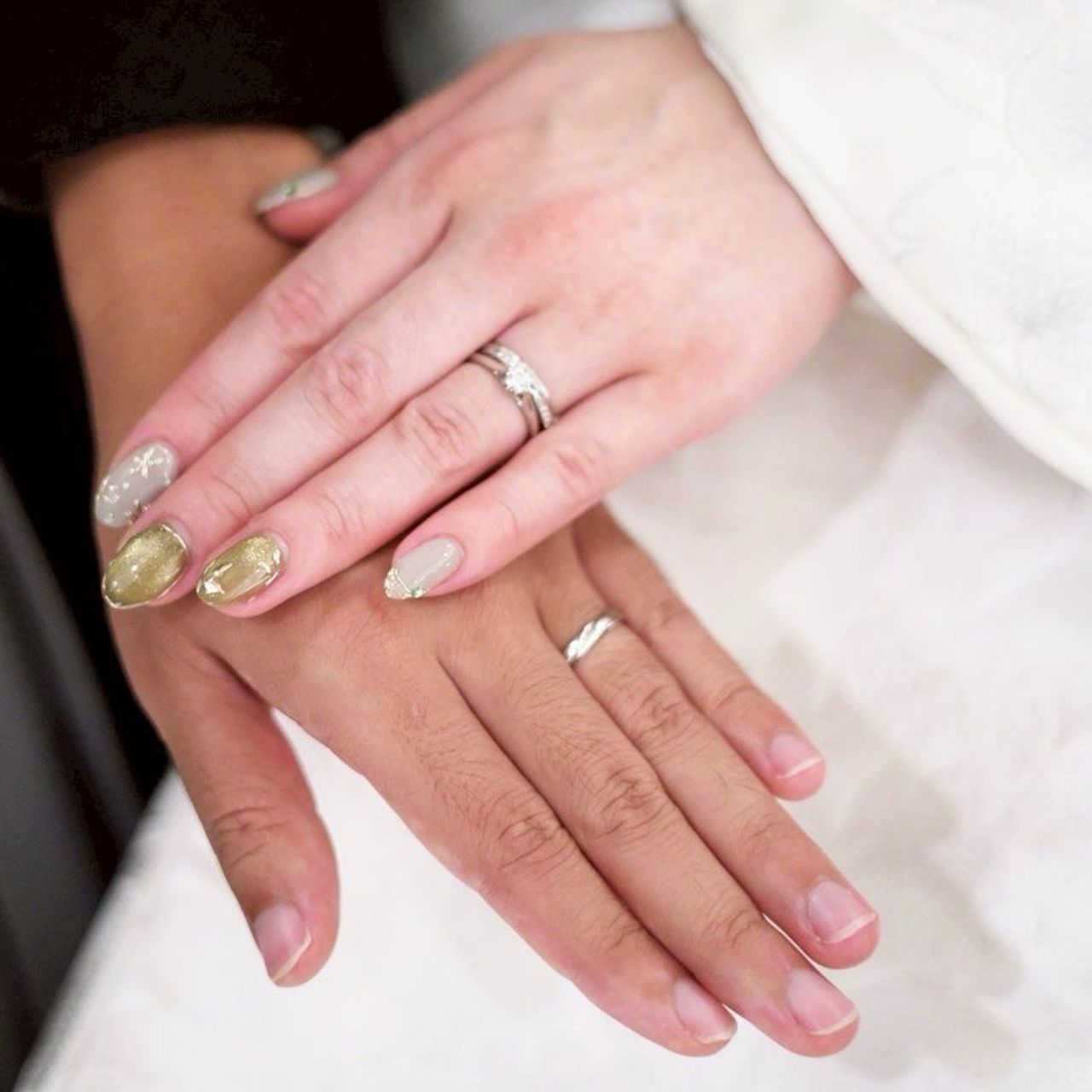 結婚指輪は、主人と一緒に指輪店へ行き、私が選びました。いろいろな指輪を実際に指に合わせてみる中で、私自身もロイヤル・アッシャーの指輪が一番綺麗に輝いていると思ったため、今の指輪に決めました。