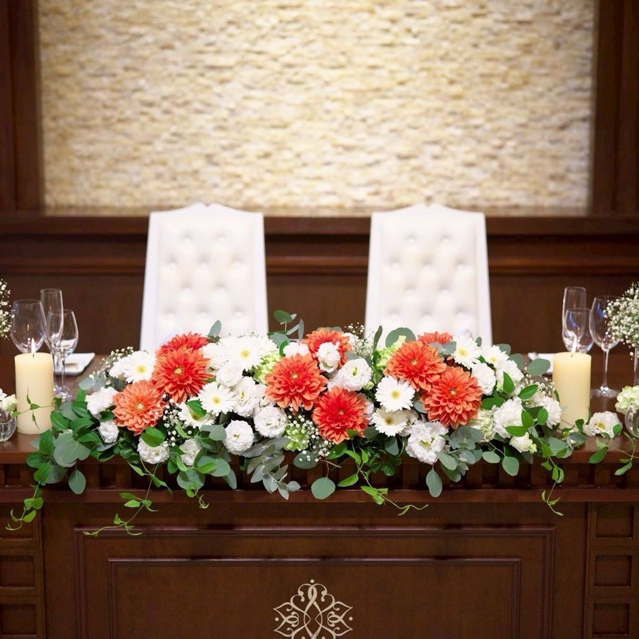 白・緑・オレンジを基調に、かすみ草やダリアを使い、華やかになるようお願いしています。特に強いこだわりはなかったので「可愛く、あとはお任せします」とお伝えしました。