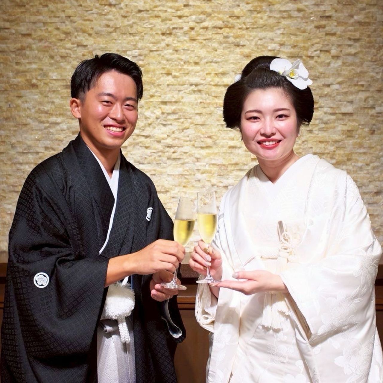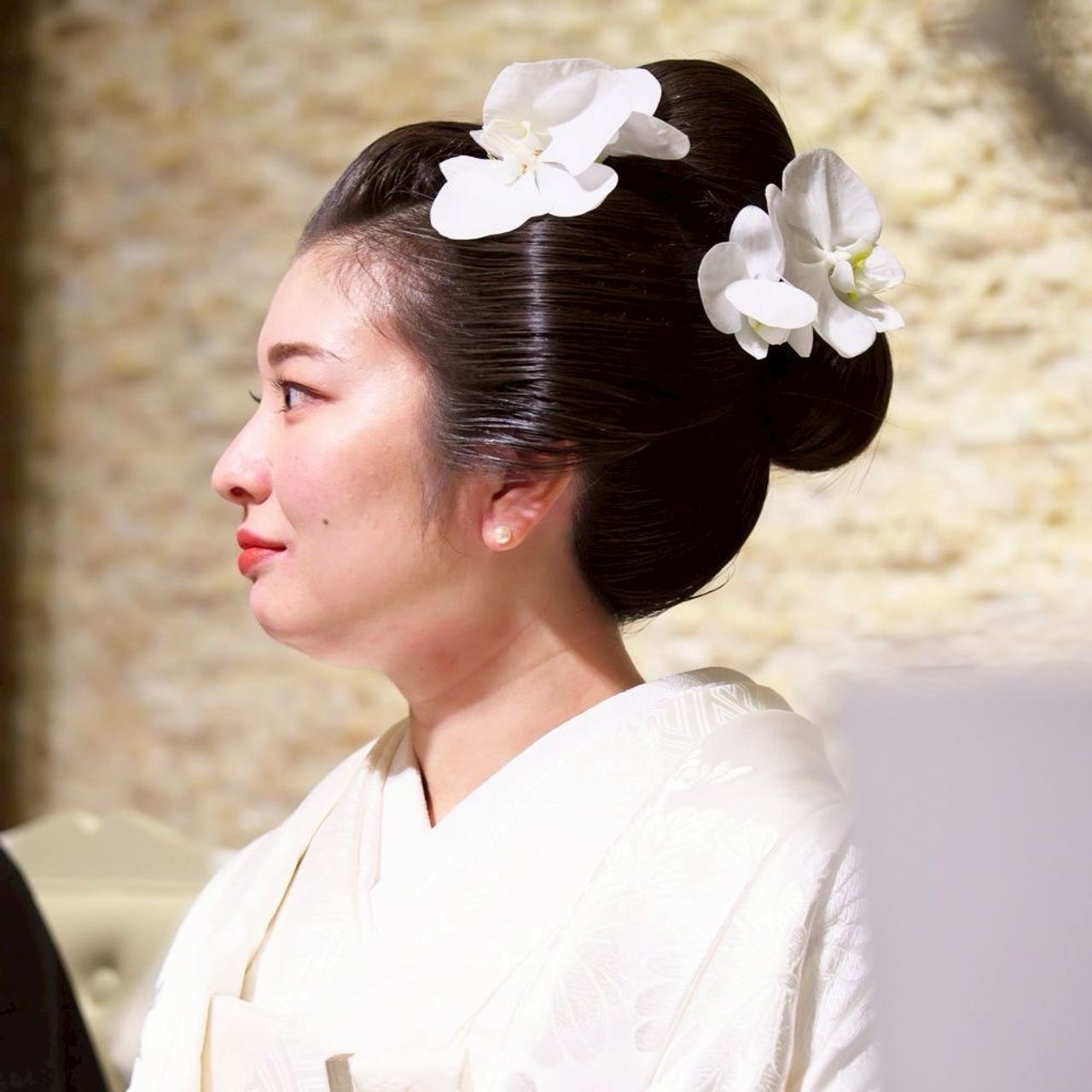 挙式では綿帽子と簪を、披露宴ではピアスと胡蝶蘭をつけました。