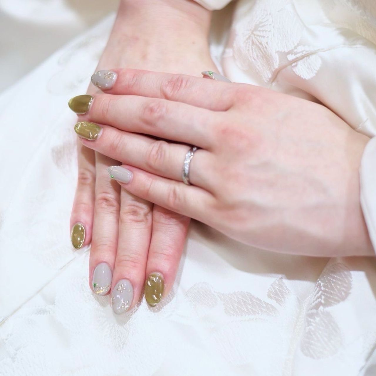 緑とグレーの秋らしいネイルにしました。