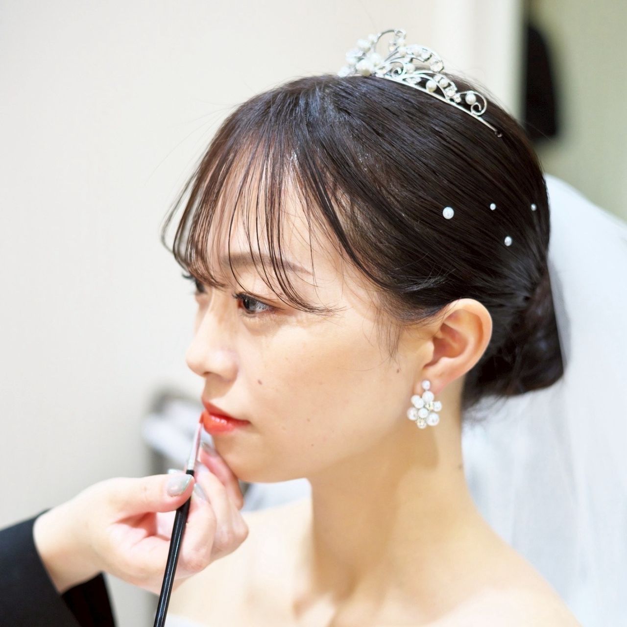 メイクは濃くなりすぎないようにして、どちらのドレスにも似合う仕上がりにしてもらいました。眉毛は、あえて薄めに整えてもらっています。