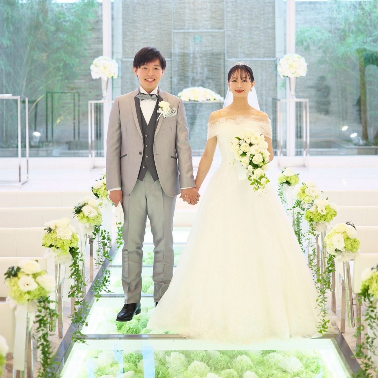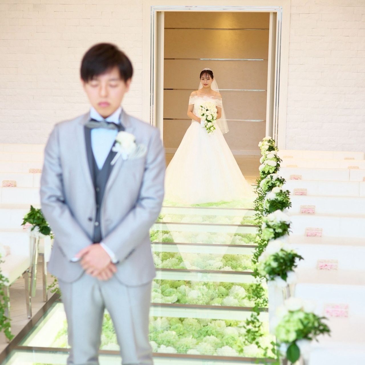 お花が敷き詰められたバージンロードはとても明るく、自然光がたっぷり入るため、写真でも顔がきれいに映ります。当日は雨が降っていましたが、会場内は光に包まれており、雨だったことを忘れるほどの明るさでした。