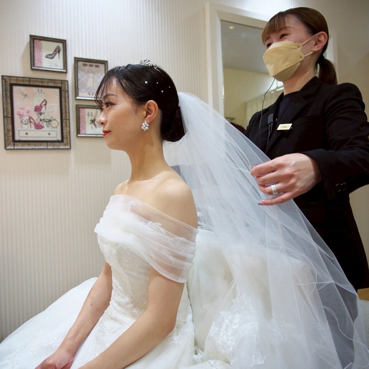 肩にお花のレースがあしらわれた、オフショルダーのようなデザインです。全体のシルエットやバランスを見ながら、一番しっくりくるドレスを選びました。