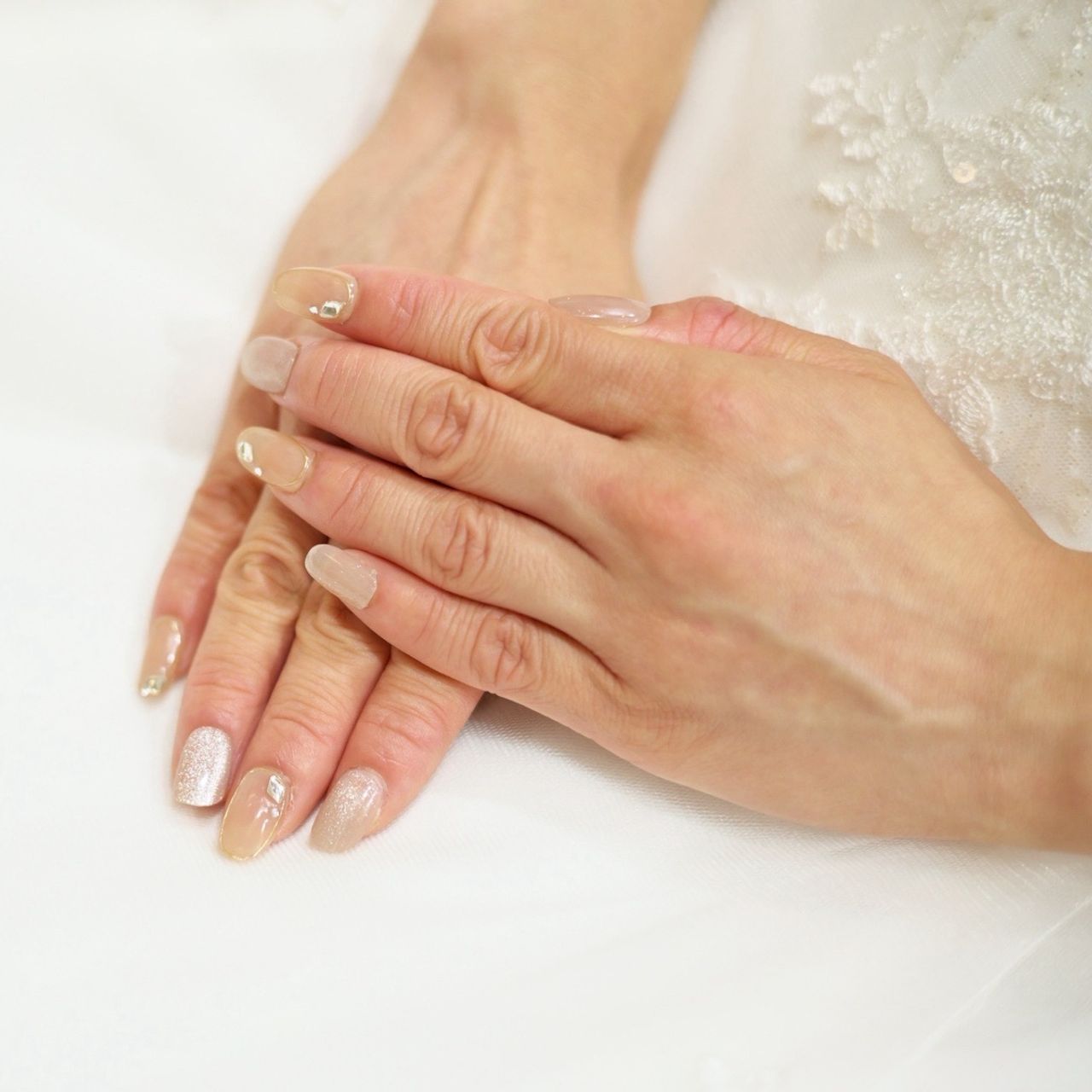 ネイルは、ウェディングドレスにもカラードレスにも似合う、淡いピンク色に仕上げてもらいました。