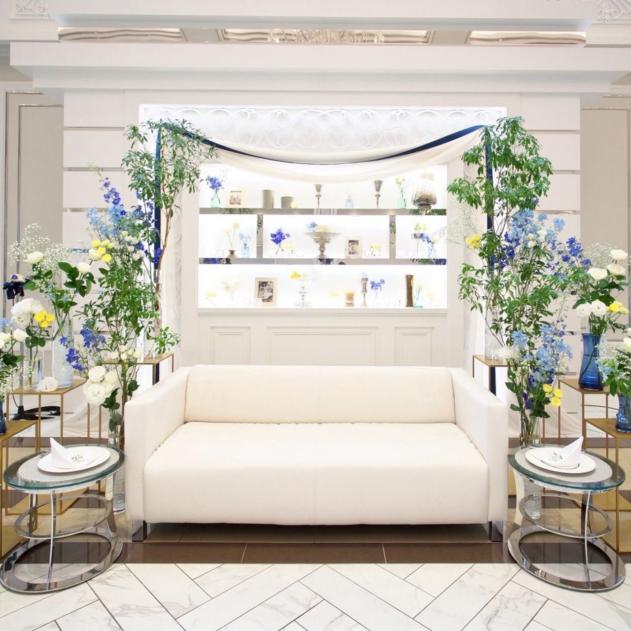 6月の挙式に合わせて、会場は『爽やかな色合い』をテーマにしました。カラードレスに青を選んだことから、装花や装飾でも青をメインに取り入れています。