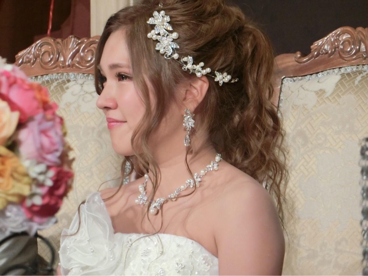 ウエディングドレスでは、キッラキラのティアラ、カラードレスでは大きなお花を頭につけました。
