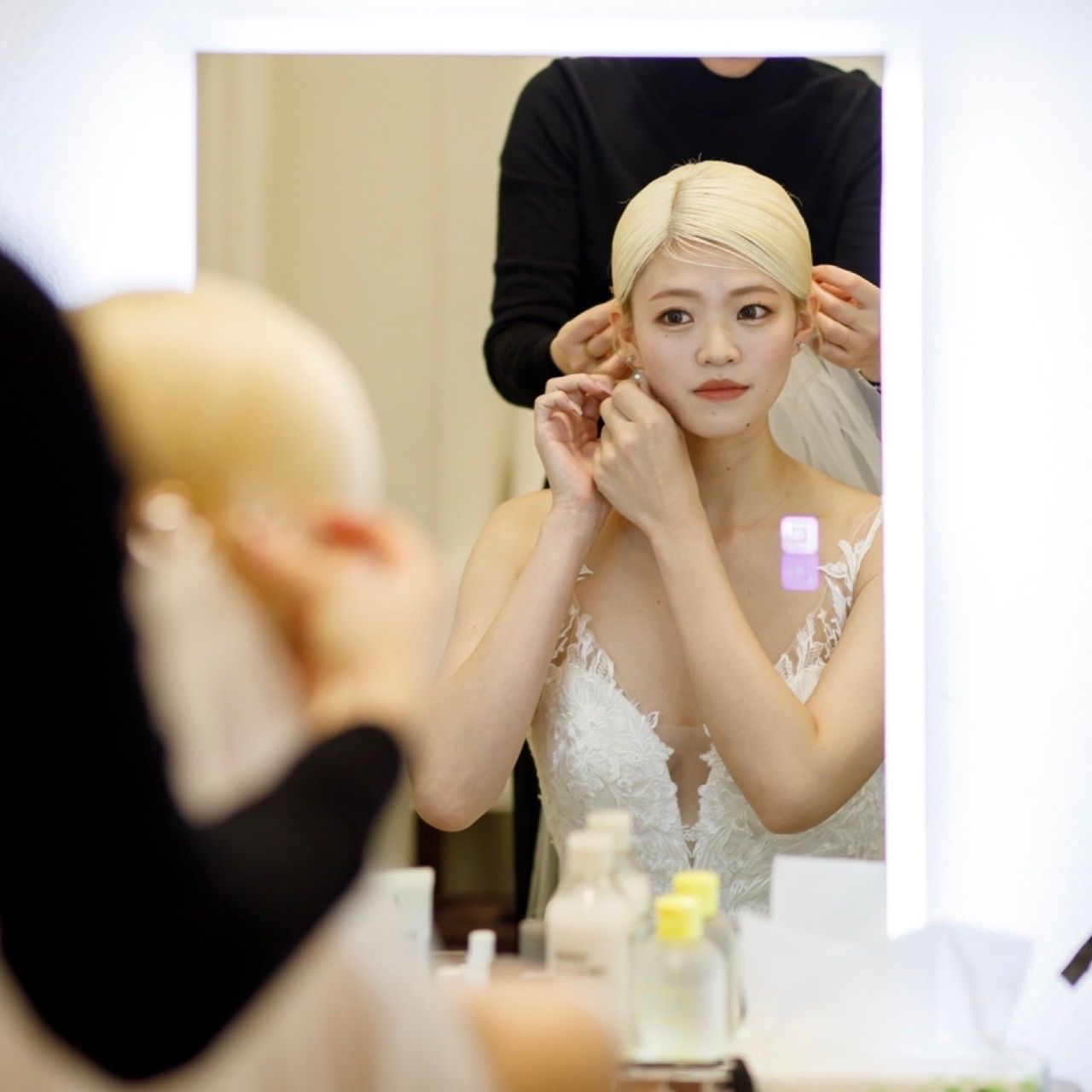 挙式はキレイめが良かったので、ボブを一つ結びにしてピタッとまとめ、メイクは披露宴でキラキラ系のメイクにしたかったので、その差を出すためにマットめのメイクにしました。