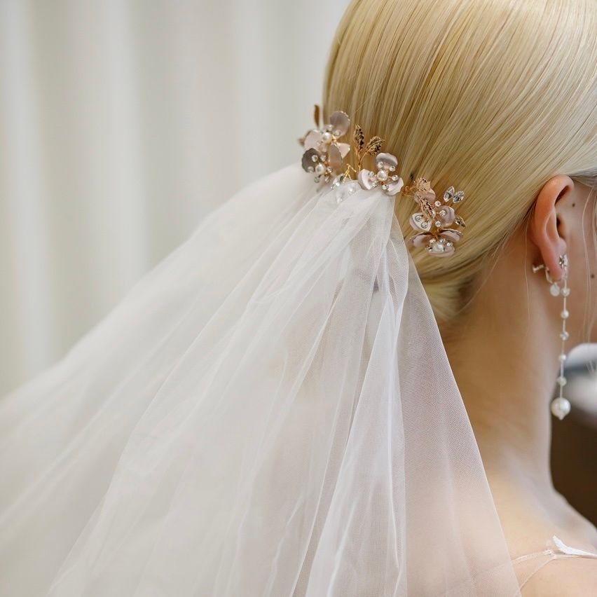 挙式のみ、ピンクゴールドの花とパールを使ったヘアアクセサリーをつけました。ベールダウンした時にあったら可愛いかなと思ったからです。当日は写真映えしたので良かったです。