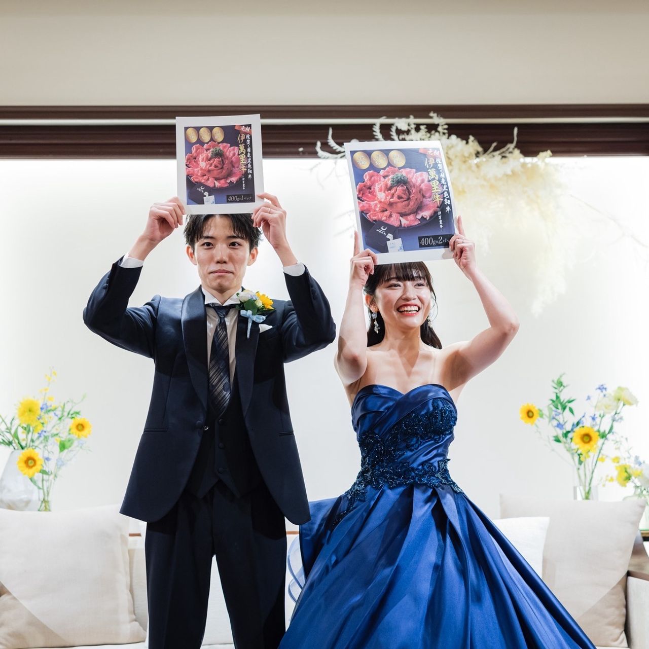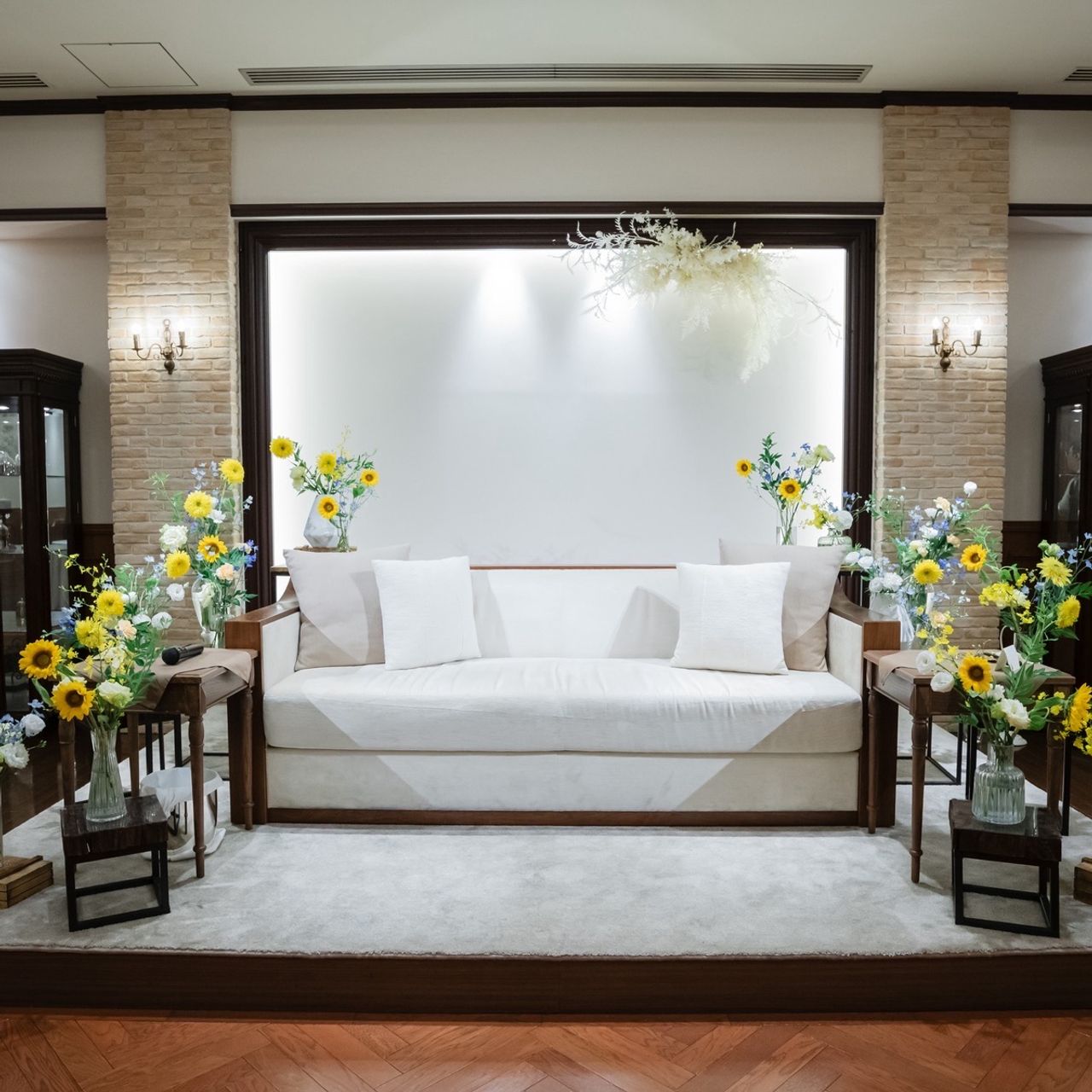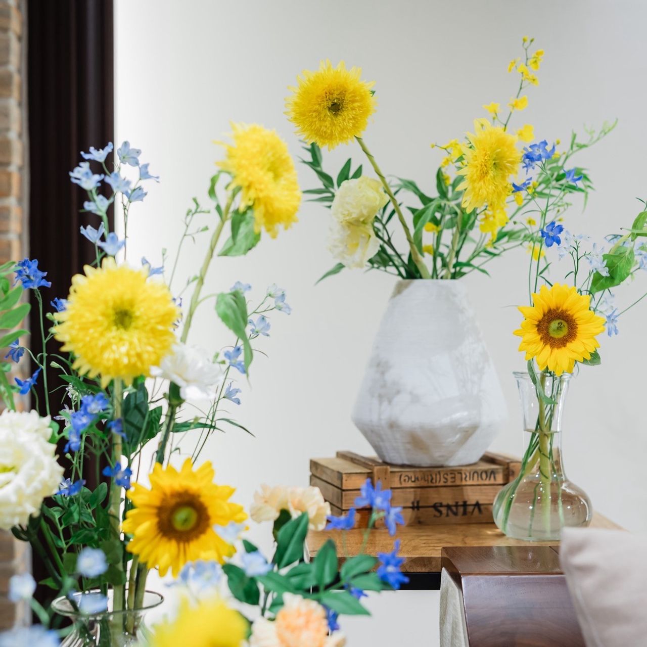 夏らしさを取り入れたかったことから、ひまわりをメインにした黄色のお花を基調に、差し色として青のお花を加えてコーディネートしてもらっています。