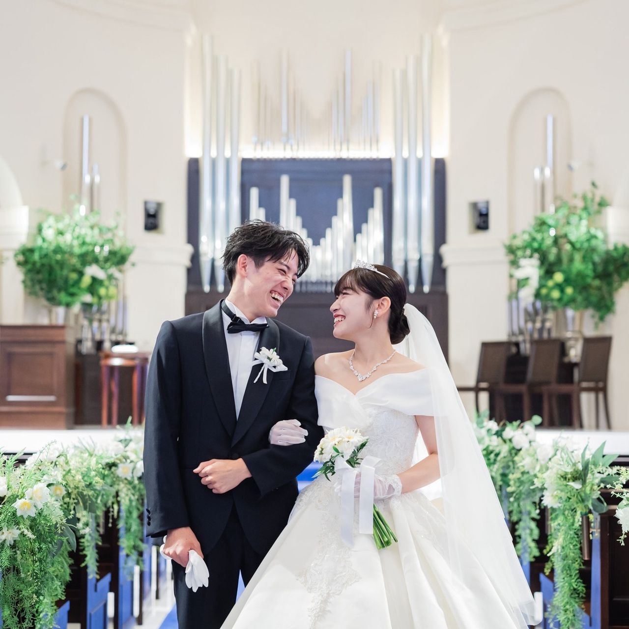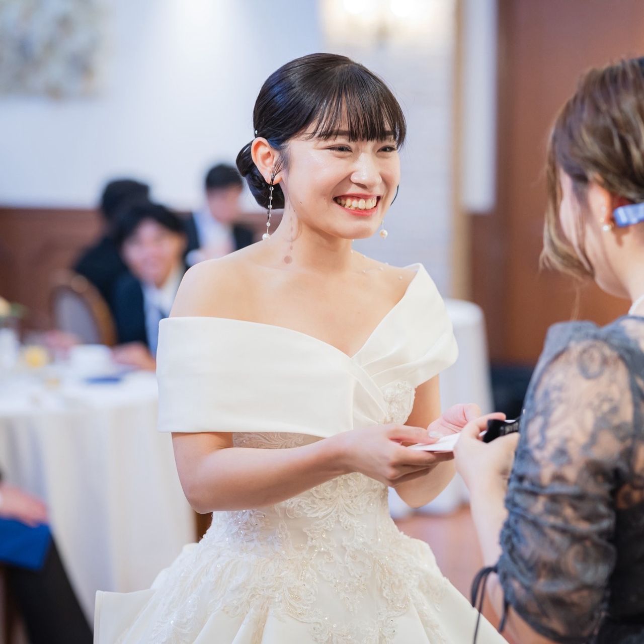 披露宴入場では、ネックレスを外し、揺れるタイプのパールイヤリングに変更しています。