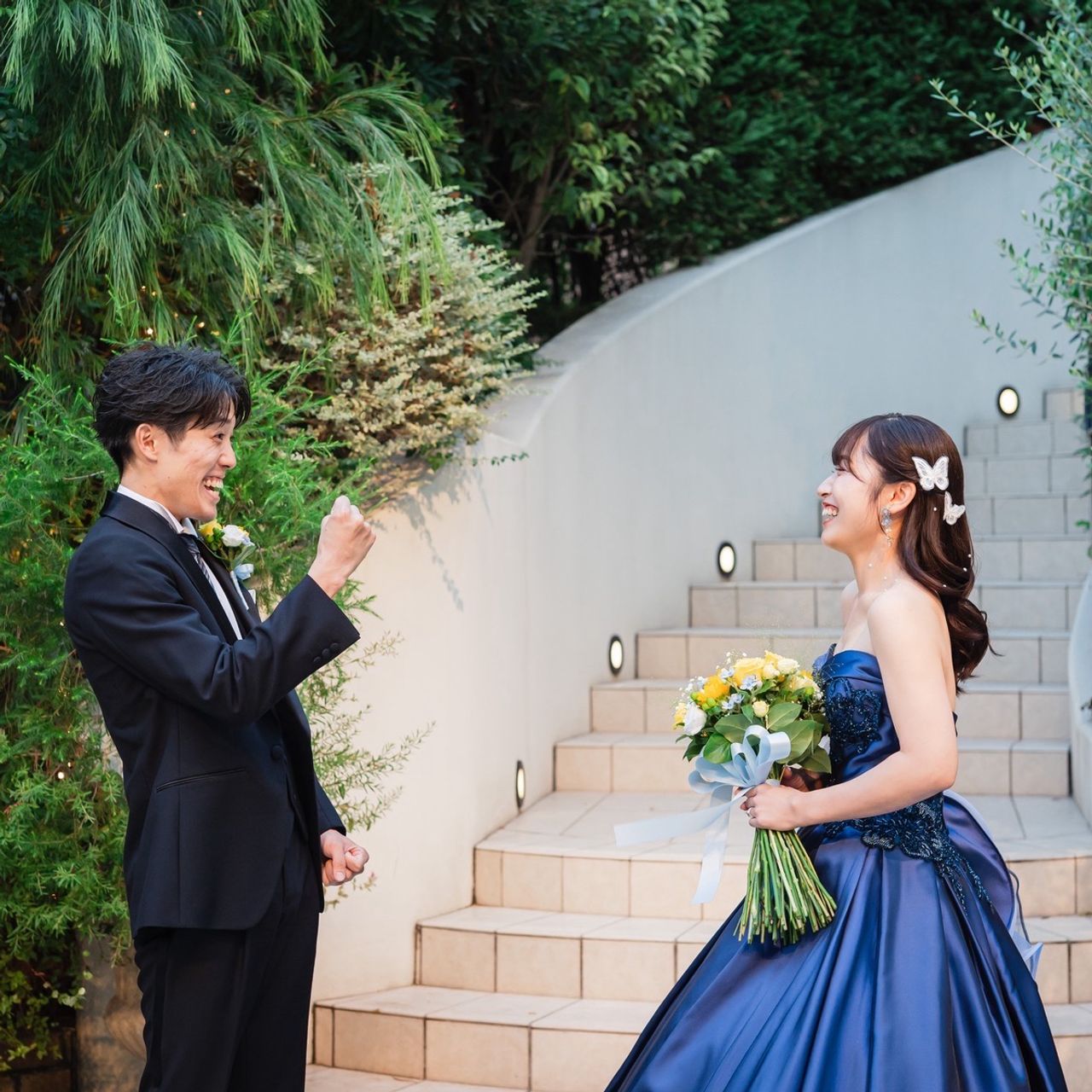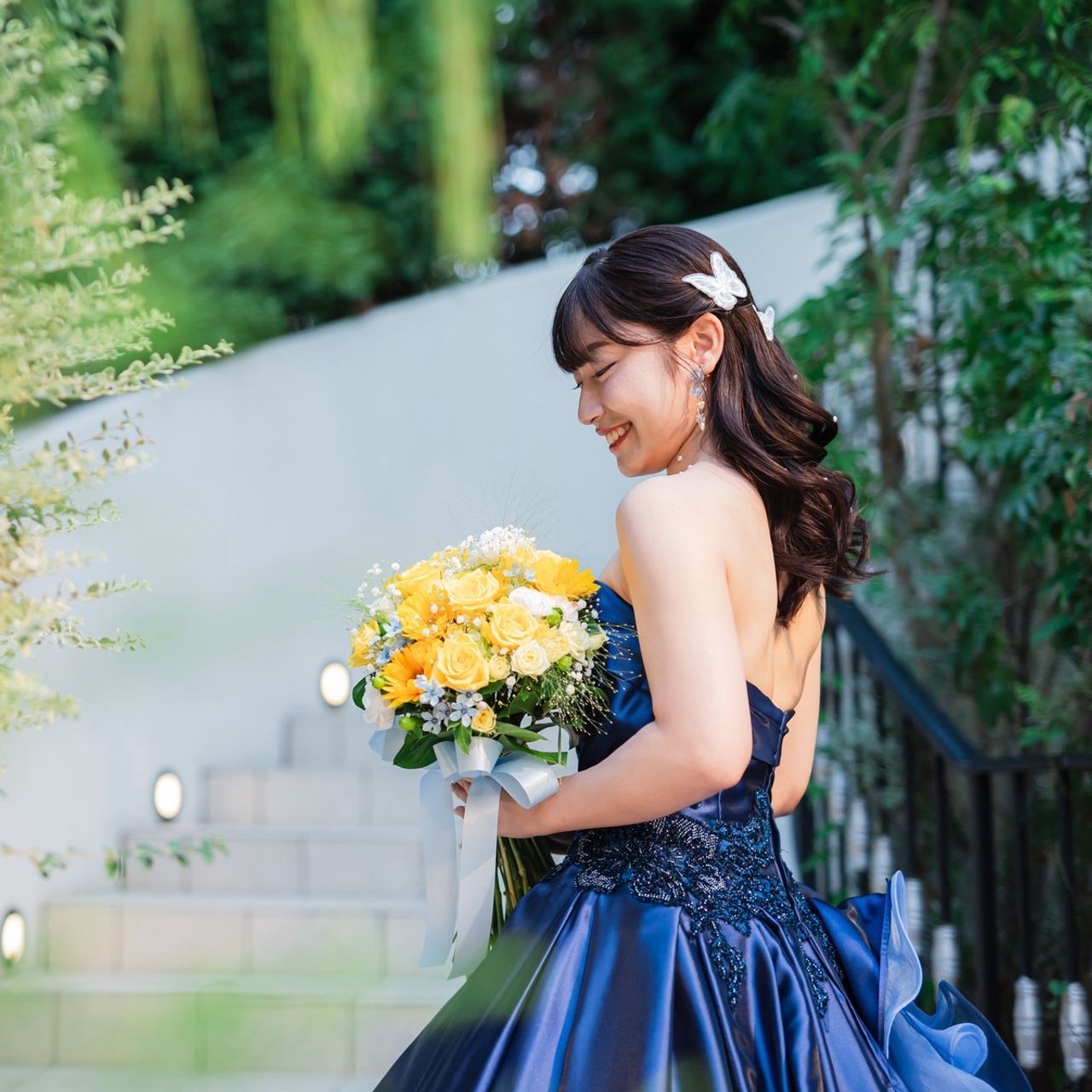 お色直しでは、髪にパールシールと蝶々のヘアクリップをつけています。