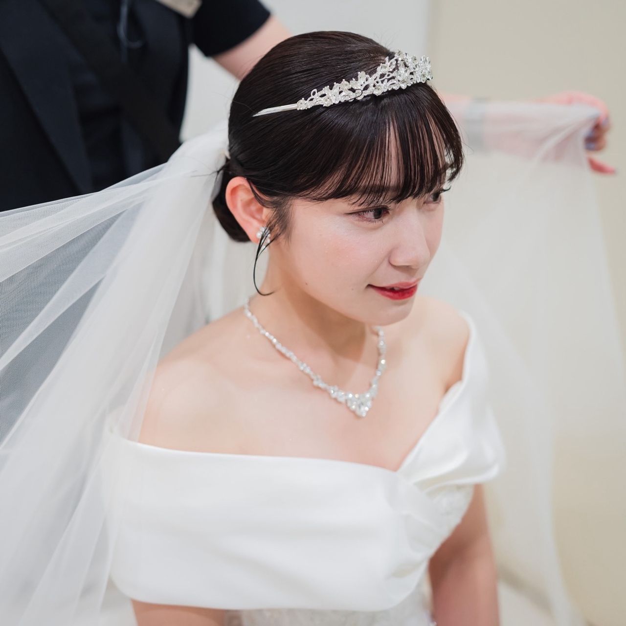 挙式ではティアラをつけて、披露宴入場ではティアラを外し、髪と肩にパールシールを貼りました。