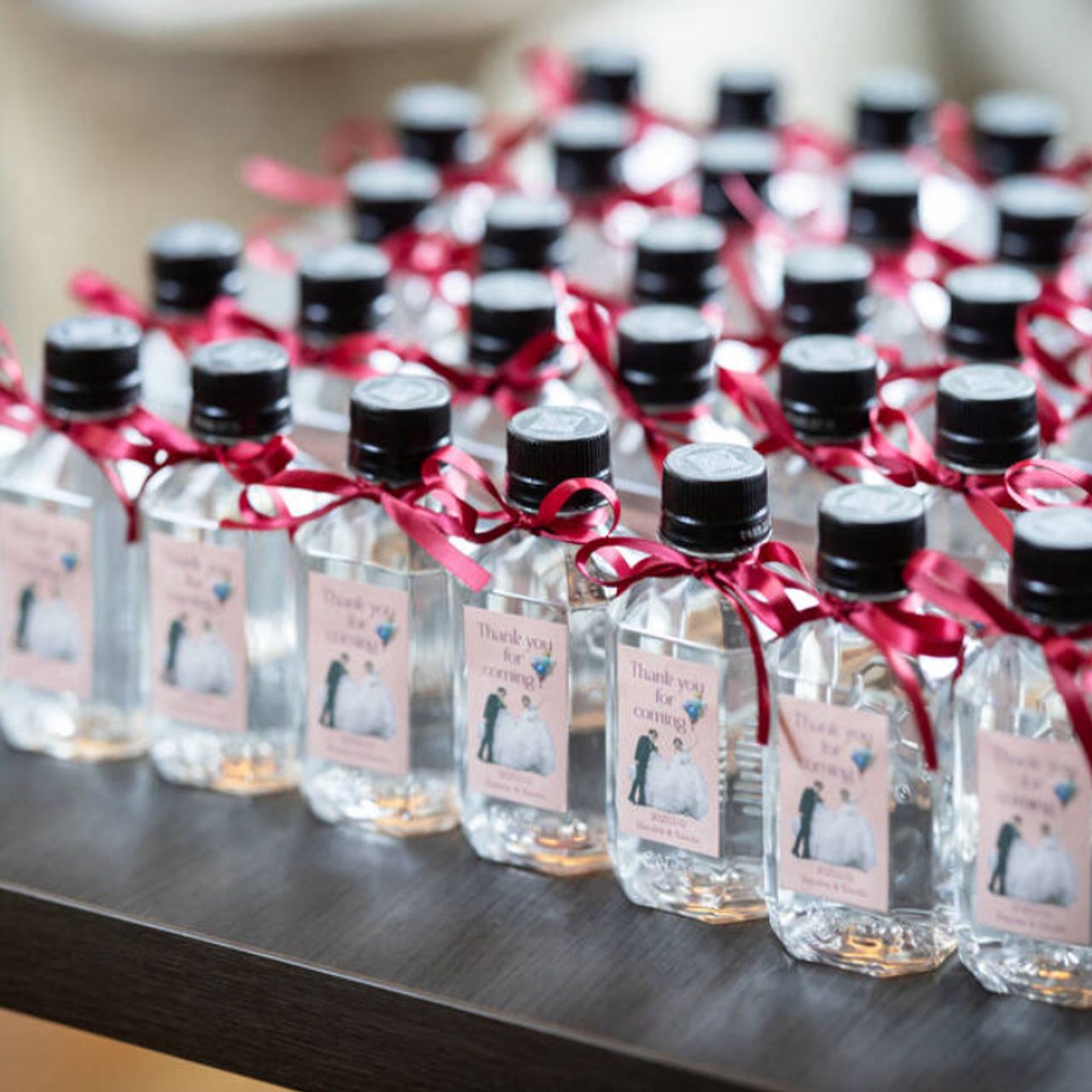 アスクルで頼んだお水にリボンを着けて、写真をシール加工したものを貼り付けました🎀