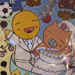 新郎新婦のモチーフキャラである、宇宙人とブタさんをケーキトップに使いました。また、うさぎをマジパンとアイシングクッキーで作ってもらって2段ケーキにしました。