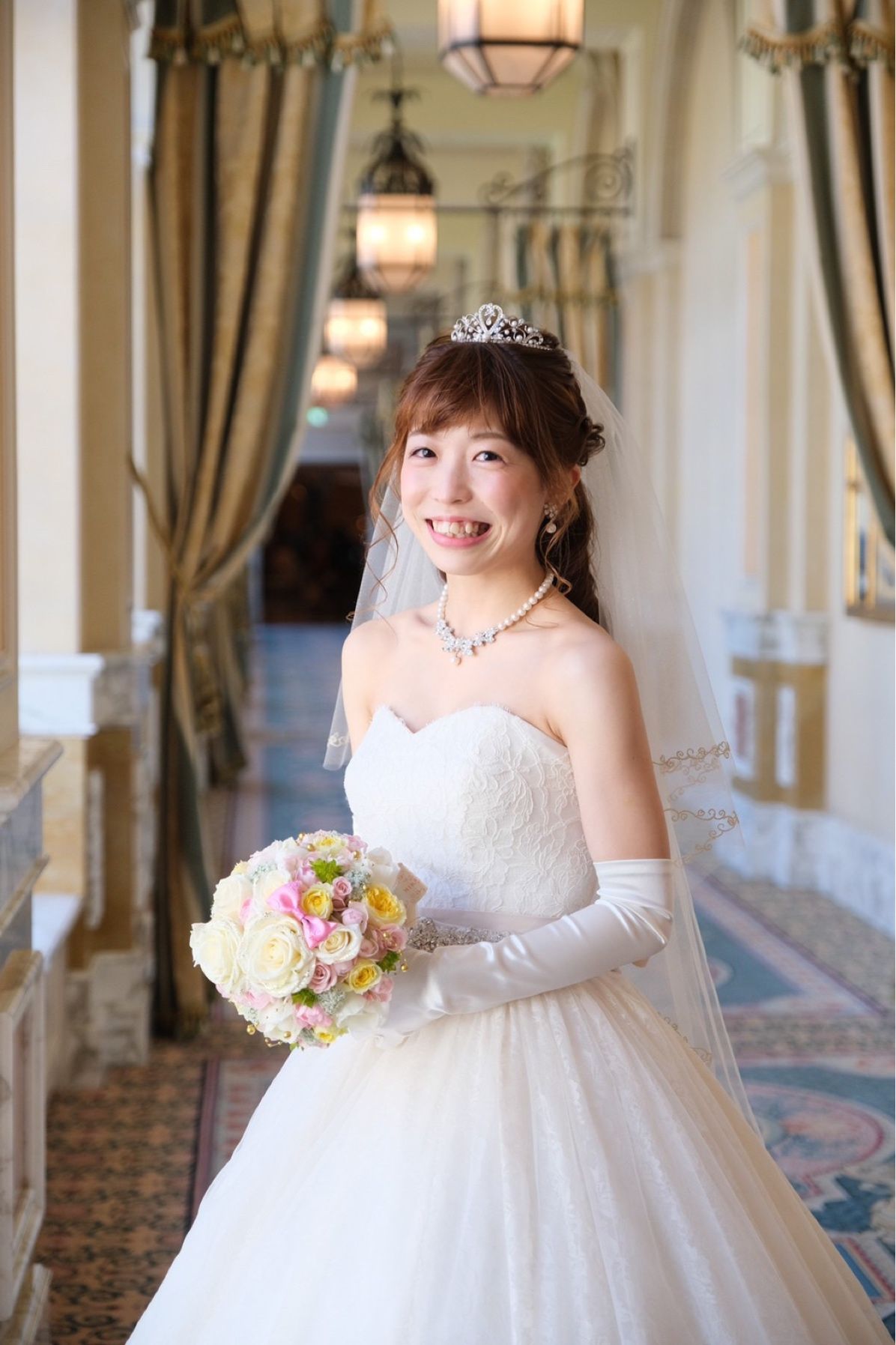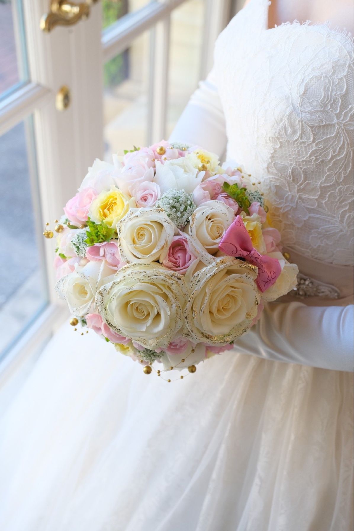 ブーケの色味はウェディングドレスにもカラードレスにも合うように、フローリストさんと相談を重ねて色味にこだわりました。さりげないミッキーミニーラウンドで、ディズニー挙式ならではのブーケになりました!