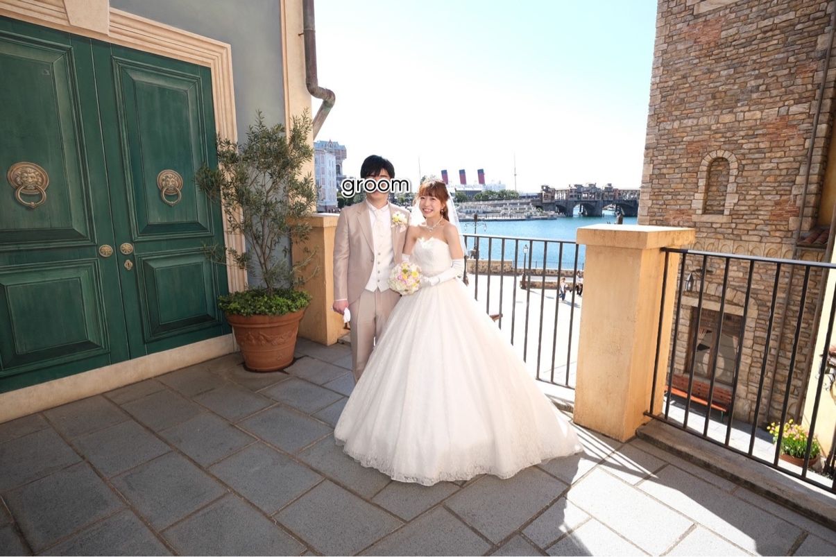 ・挙式後はテラスに出てお写真撮影が出来ます!祝福の鐘が鳴り響き、ディズニーシーにいる方もこちらに手を振ってくれます!