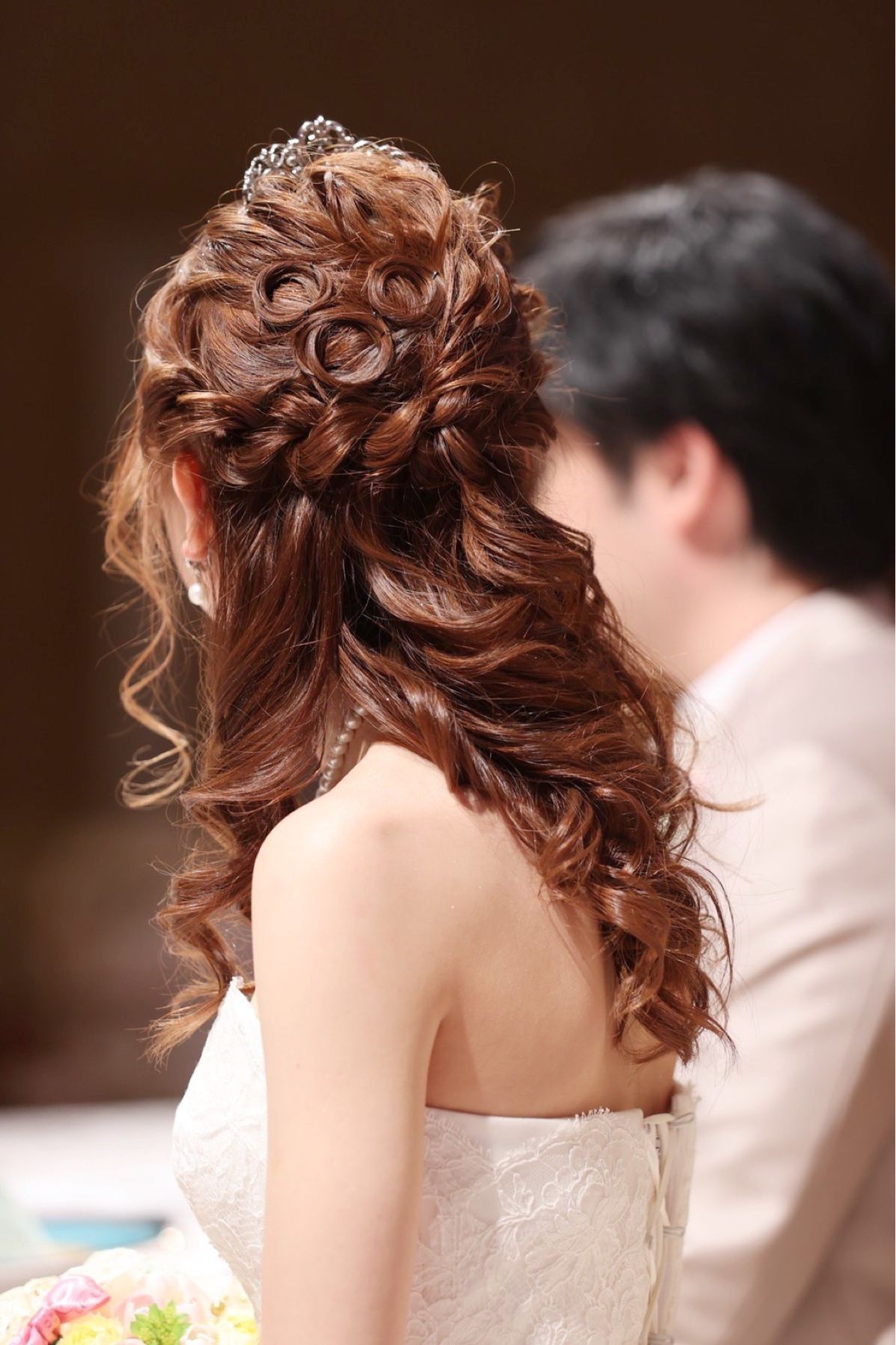 普段、巻きやパーマがかかりにくい髪の毛なので、くるくるにしたいという憧れがあり、髪型はハーフアップにしました!さりげなく隠れミッキーをつくってもらったのがポイントです!披露宴の前には髪の毛全体にキラキラスプレーをかけてもらいました!
