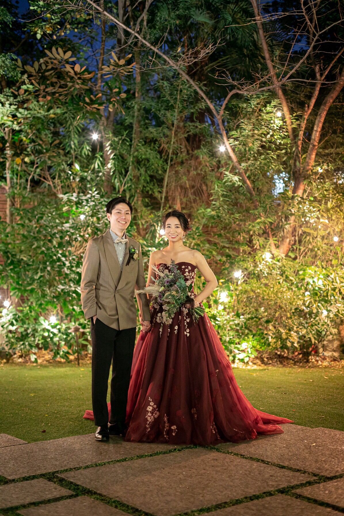 挙式会場も緑が見えるので素敵ですが、夜になってからのライトアップも綺麗なので、特にトワイライトウェディングをお勧めします!