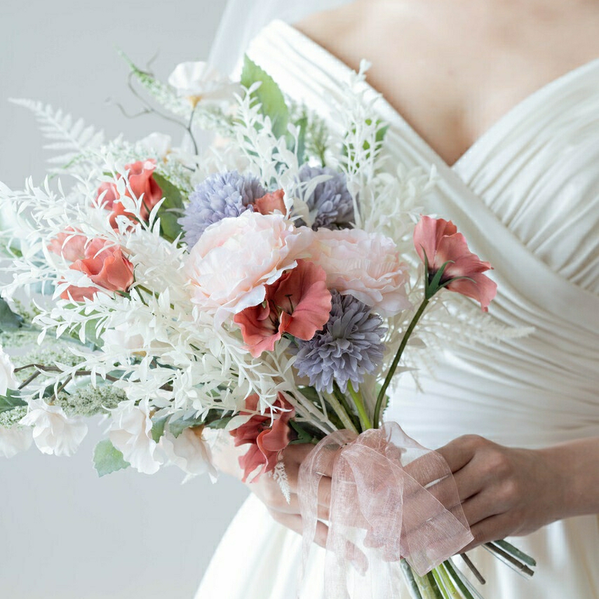 サーモンピンクを基調としたアーティフィシャルフラワーを夫と一緒に買いに行き、自分たちでテーブルコーディネートをしました。