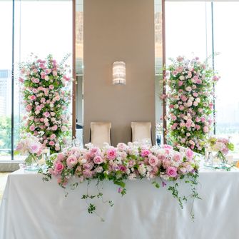 装花デザインにはテーブルクロスの色や、椅子カバー、披露宴会場に入れる楽器選びまで気を遣いました。
