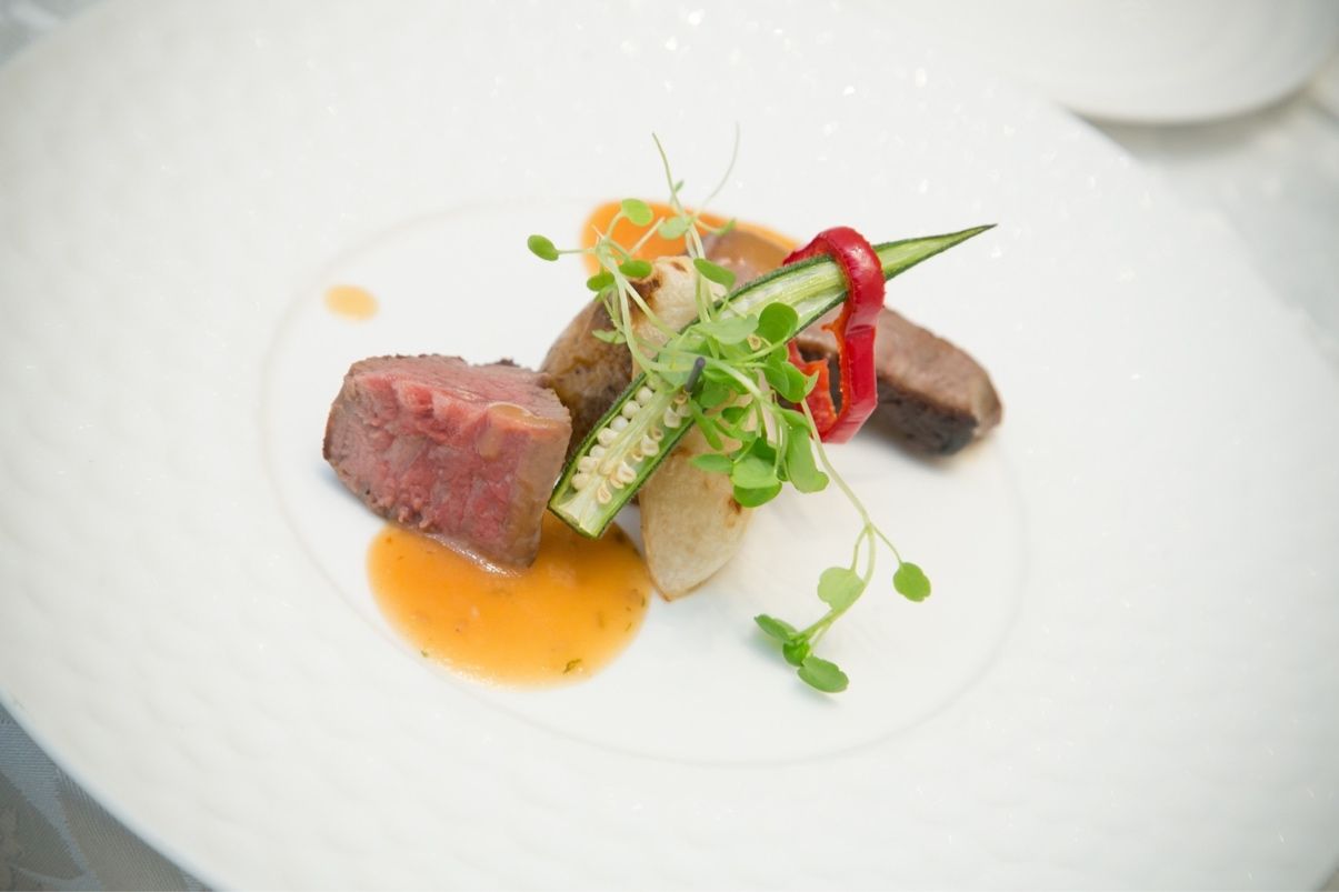 ブライダルフェアで試食をし、その中でも特に美味しかった、九条ネギ香る味噌ソースの牛フィレのポワレとピスタチオのブリュレを最初に選びました。