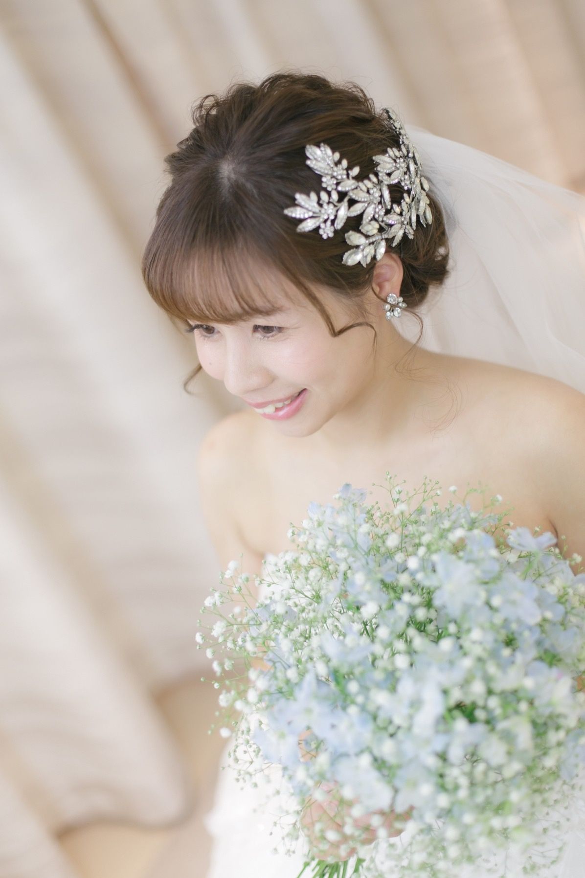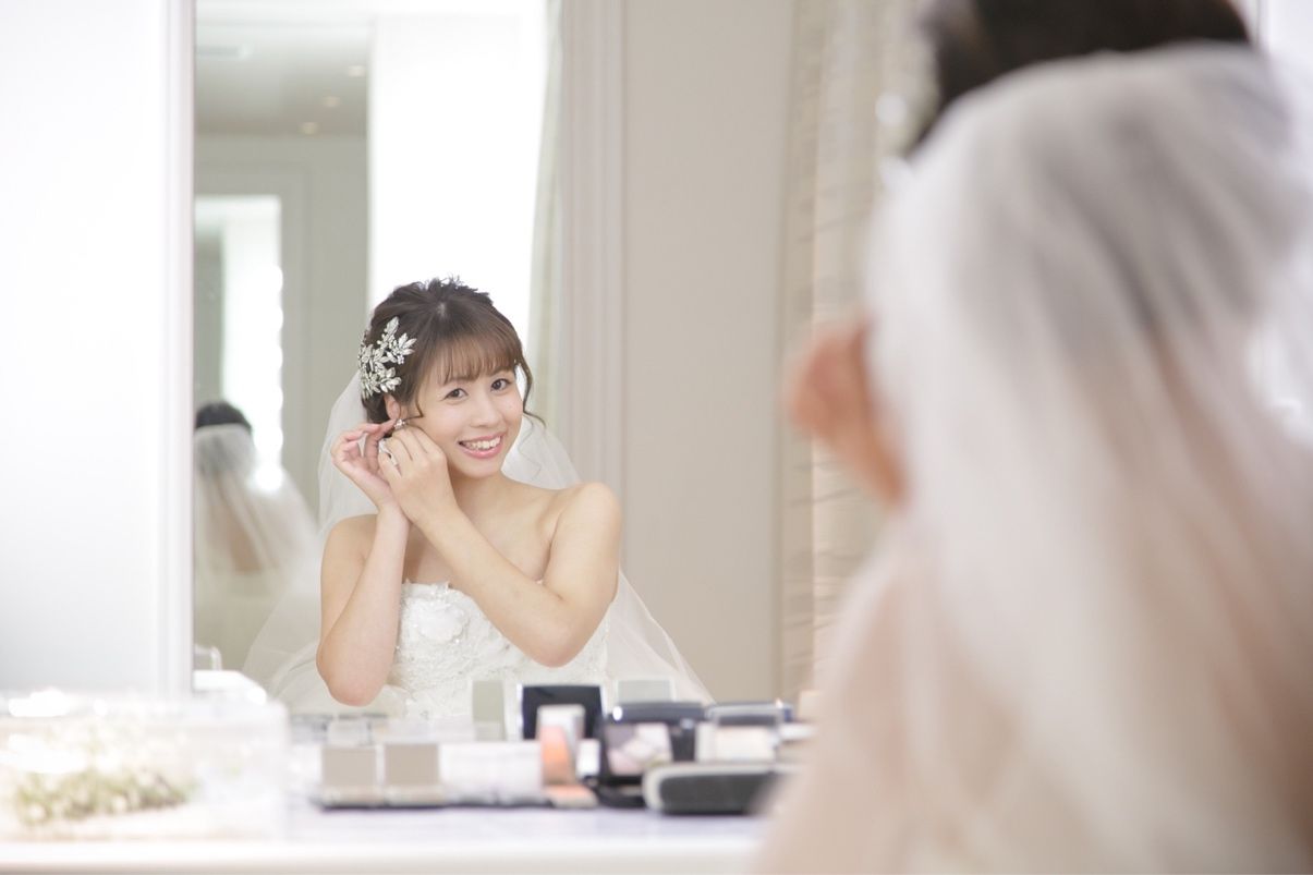 ウェディングドレスでは髪型を低めのシニヨンでシンプルにまとめたので、耳元から後ろまで届くような大きめのデザインのものにしました。