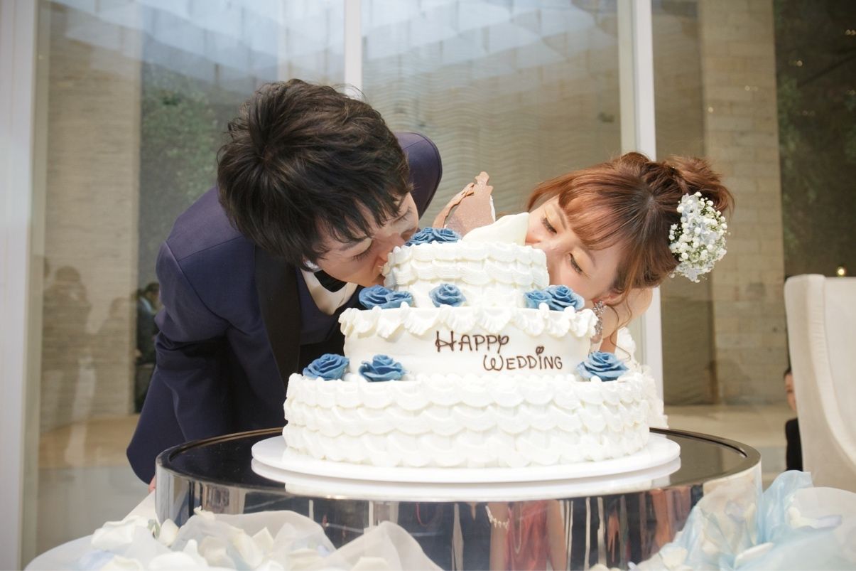 ファーストバイトをスプーンでするのが恥ずかしかったので二人でケーキにかぶりつく演出にしました。