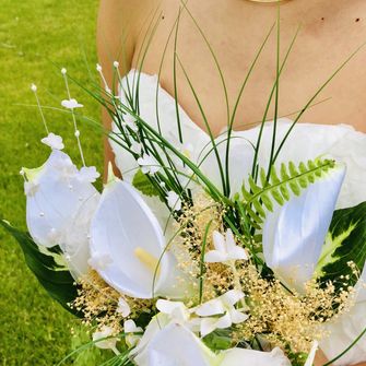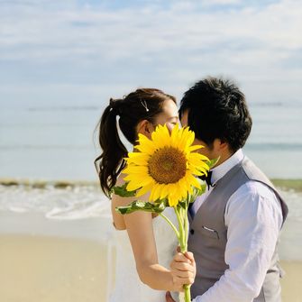 大人リゾート、海がテーマの披露宴にしました。挙式はダーズンローズを取り入れて感動的に披露宴は3.9とゆうこともありサンキュー婚とし感謝をつたえるをコンセプトにしました。