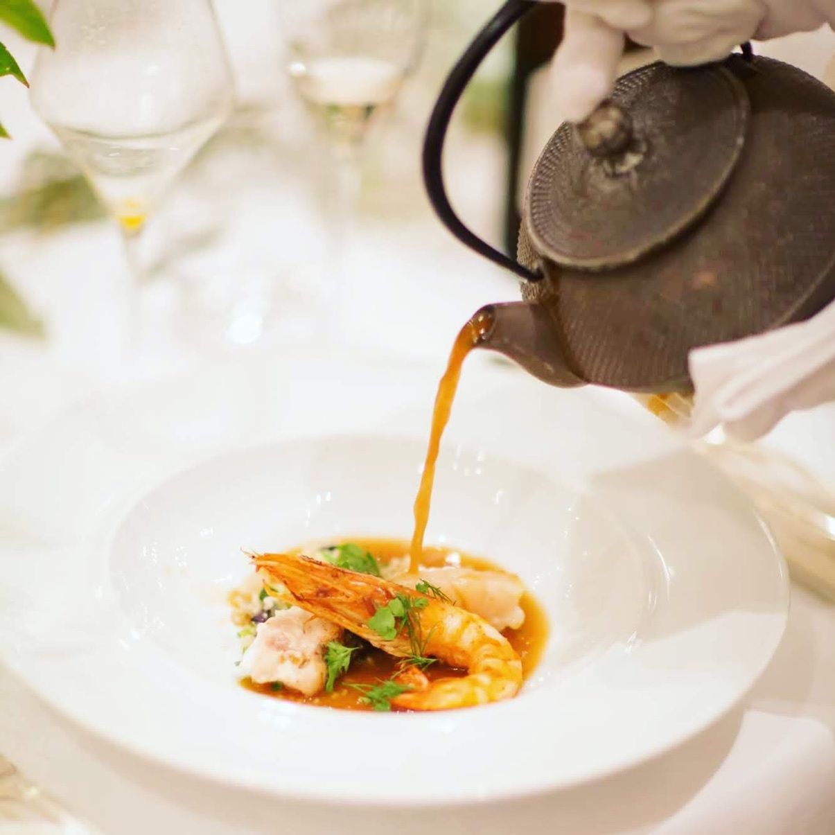 お肉は試食で感動した仙台牛のステーキにランクアップ。見た目にも楽しんでもらえるよう、お魚はその場でスープを注いで完成するズッパディペッシェというお料理を選びました。