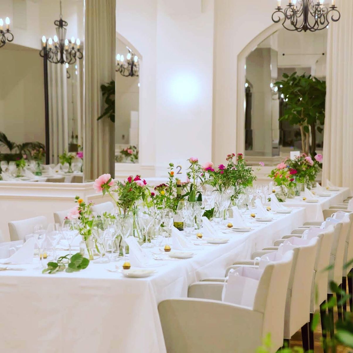 外国の晩餐会のようなイメージにしたいという希望をプランナーさんに伝えたところノリノリで協力してくださり、 普段こちらの会場ではあまりやらない流しのテーブルにしていただくことができました。