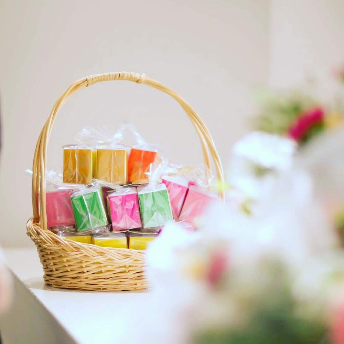 一次会では福砂屋のフクサヤキューブ(春限定カラーで、装花の色に合わせました。