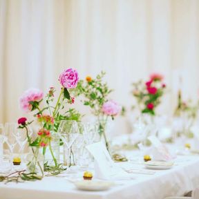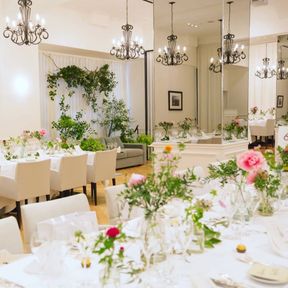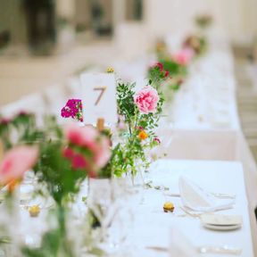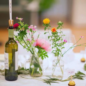 会場装花は流しのテーブルを生かして複数の小瓶に分けて活けていただき、テーブルにはグリーンを散らしてもらいました。メリハリをつけるために高砂は敢えてお花を入れずにグリーンだけで豊かに装飾してもらいました。
