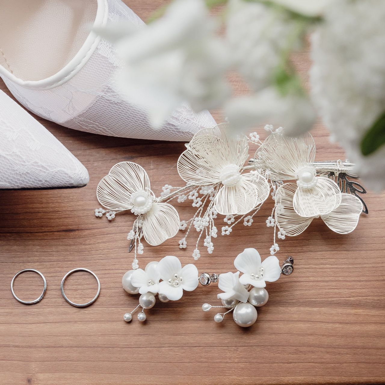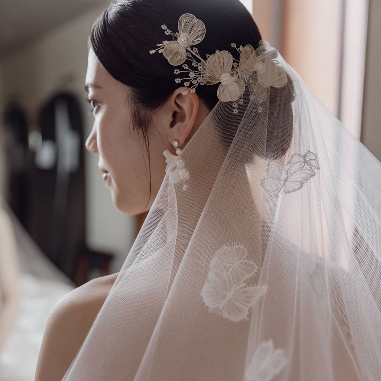 ドレスに合わせてヴェールも花柄の刺繍が入ったものにしたので統一感が出るようにアクセサリーも雰囲気を合わせました。