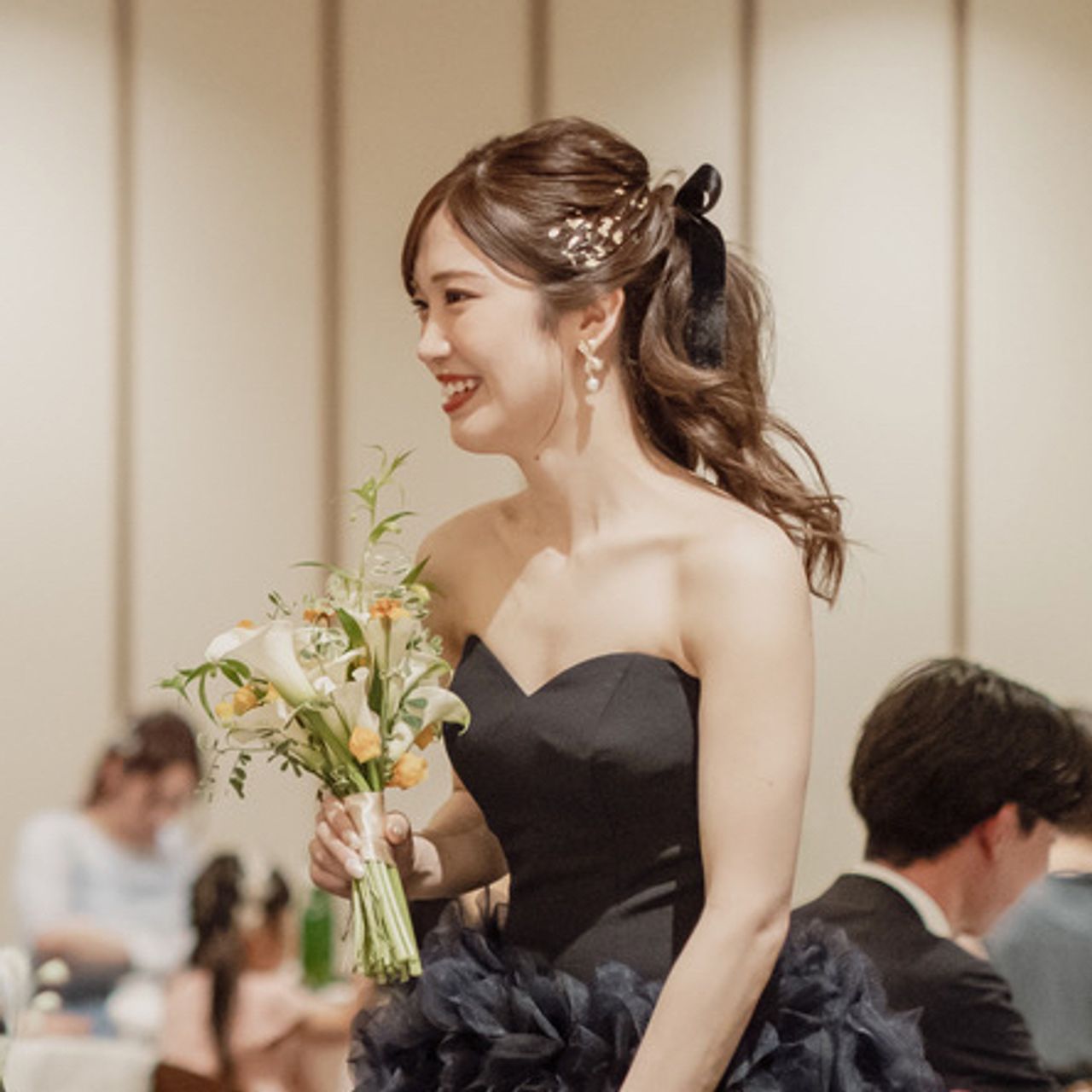 ドレスがブルーブラックだったのでブラックのリボンでポニーテールスタイルにしました。片側に金箔をつけて華やかさを+しました。