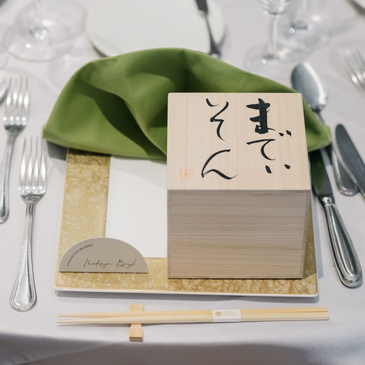 ゲスト全員に『ル・スールフリーカップ』を贈りました。カップは木箱におさめられており、その木箱に筆の手書きで名前を入れてもらえたので、席札としても使用しました。