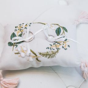 待ち合い室はゲストに楽しんでもらえるようフォトプロップスや写真をたくさん飾り、高砂ではソファにgroom・brideのクッションを飾って華やさをアップ、リングピローは結婚式が終了しても家でも飾れるよう、ボタニカルモチーフを刺繍したものにしました♡