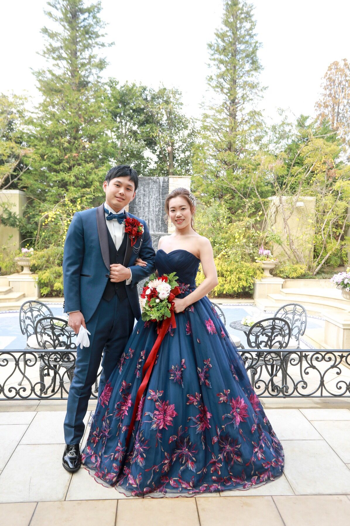 サムシングブルーの1つ目、「何かブルーのアイテムを身につける」ため色はブルー系に。 その方でも決め手は丁寧に刺繍されたショッキングピンクの花!何層にも重なったカラフルなチュール!ただのネイビー1色では作り出せない素敵な色のドレスでした。