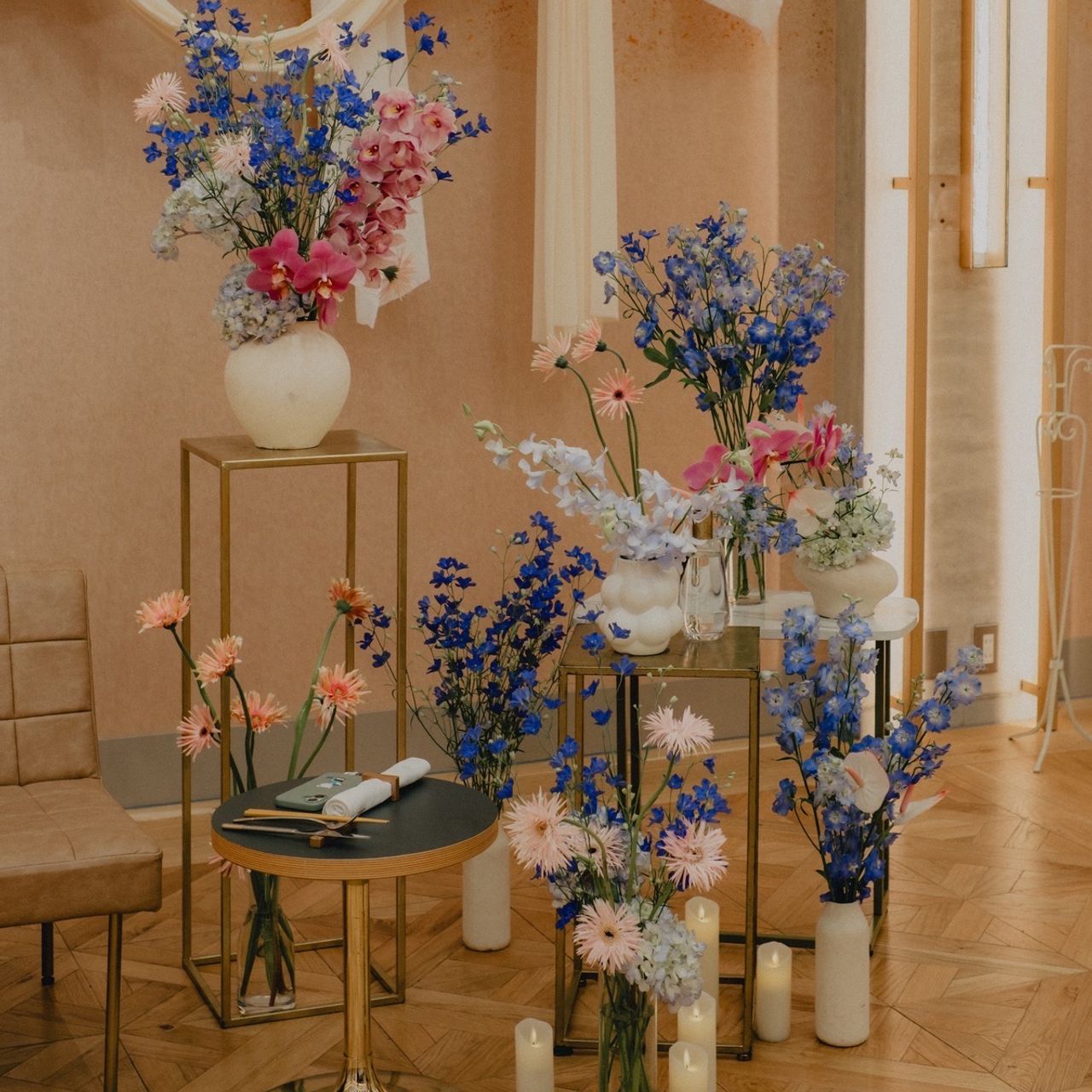 装花はRau'X Deco(ローデコ)の藤本さんにお願いしました。青をメインに、水色やピンクを差し色として加えていただき、遊び心のある配色に仕上げてもらっています。テーマカラーである青いお花に、ピンクや水色が重なり合い、会場全体が柔らかく華やかな印象になったと思います。