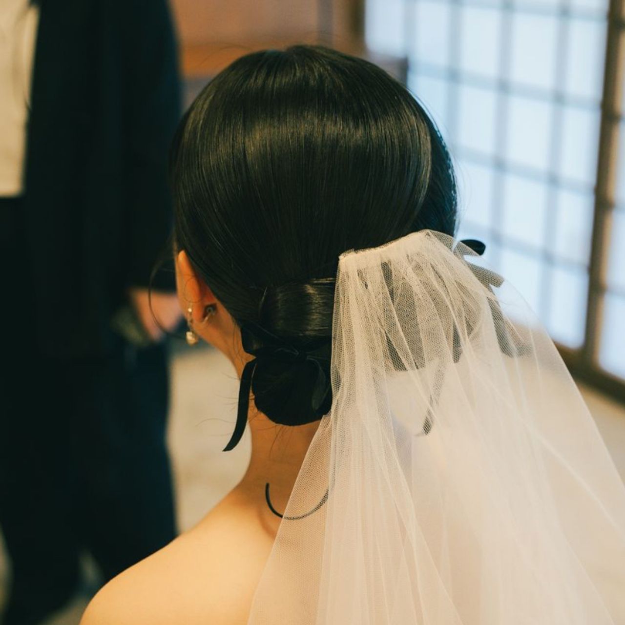 挙式ではベールの下に黒いリボンをさりげなく忍ばせ、披露宴ではリボンの量を少し増やし、華やかなスタイルで入場しています。