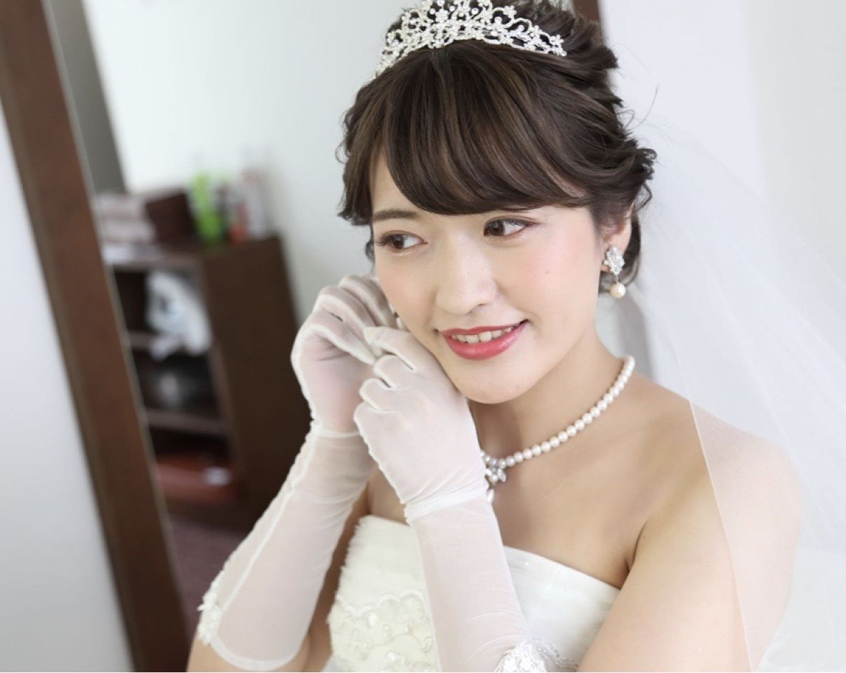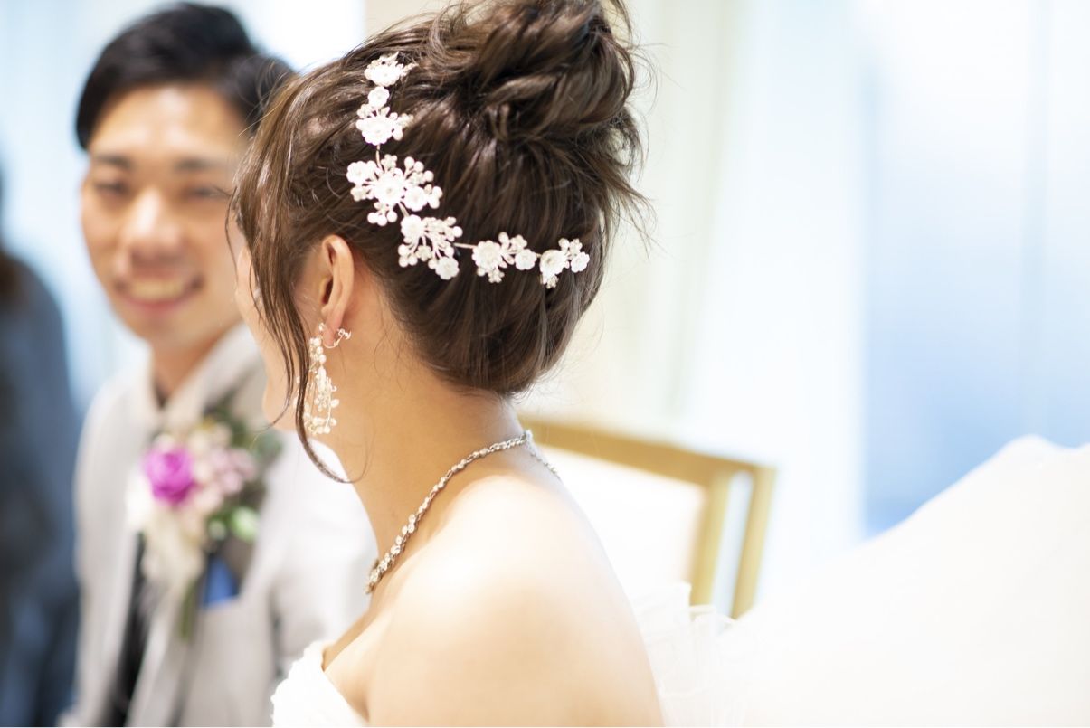 挙式のときはティアラ、披露宴入場のときは花の形のパールを使った長めのヘッドアクセサリー、お色直し入場のときはオーダーで作っていただいたプリザーブドフラワーの花飾りをつけました!