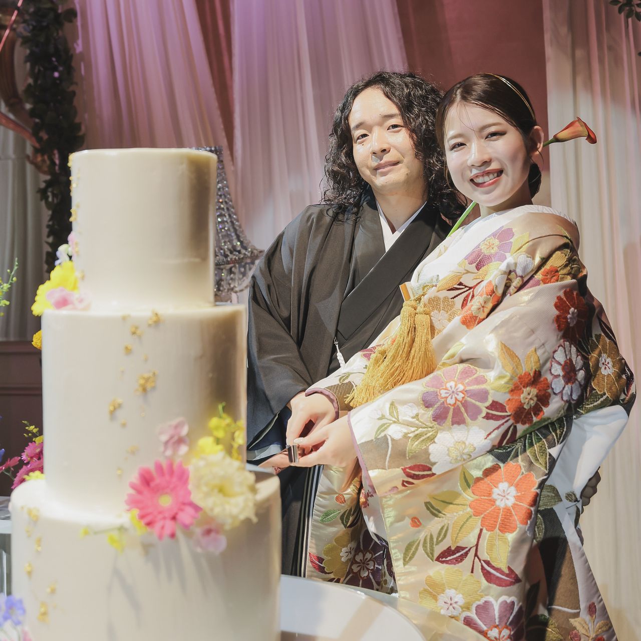 和装はとても悩みました。色や柄で印象がとても変わるので、ドレスと同様沢山試着をし秋らしさも少し取り入れつつゴールドや淡いカラー、くすみカラーが使われているこの色打掛を選びました!