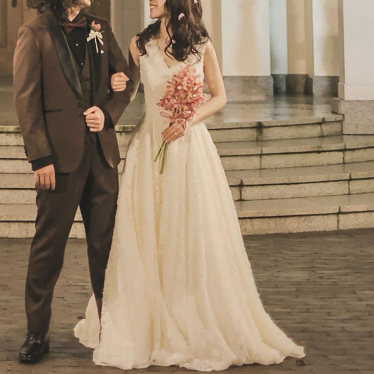 絶対にマーメイドラインを着たいという憧れがあり、沢山試着をした中で選びました。Instagramでこのドレスを見つけて、衣装のスタッフさんに相談し取り寄せていただき、実際に見たときは感動し即決しました!🤍