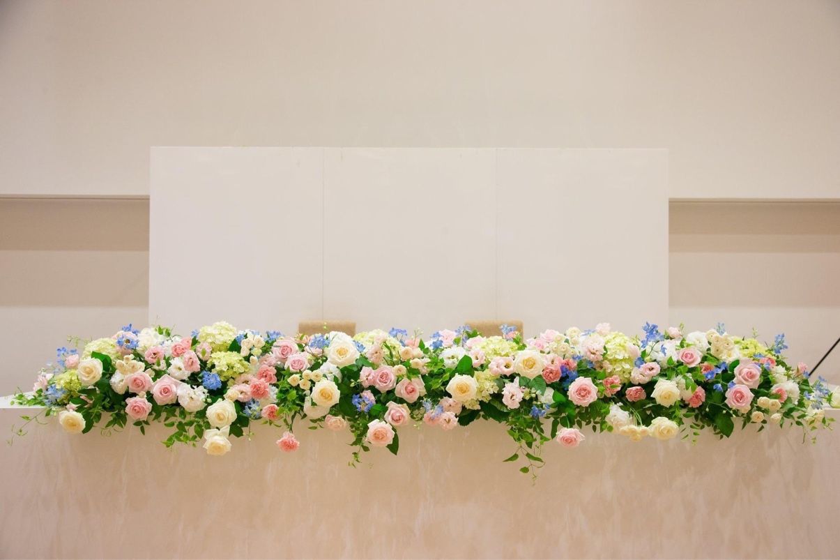 メインテーブルの装花は白、ピンク、水色でお願いしました。