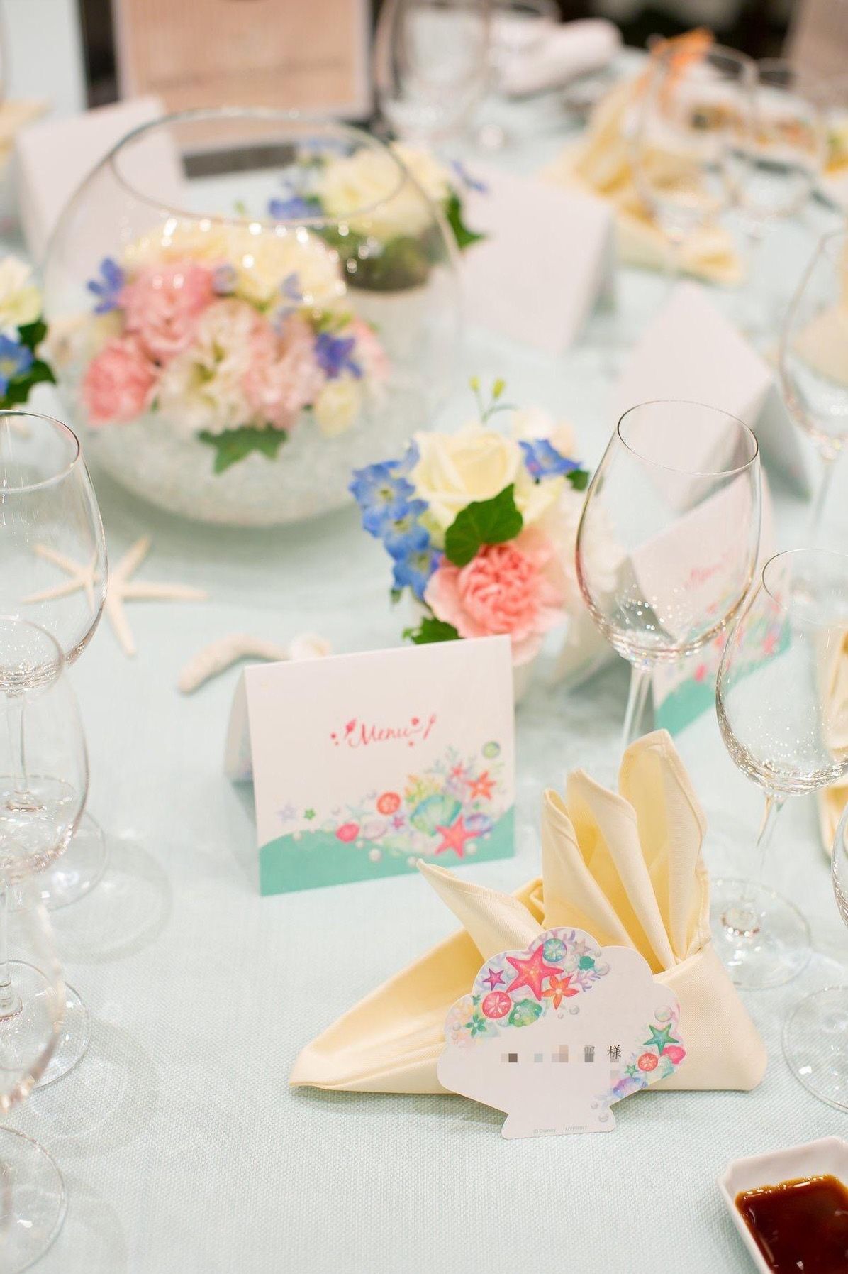 席札やメニュー表もディズニー公式のリトルマーメイドのものにしたので、テーブルがとても華やかでした。