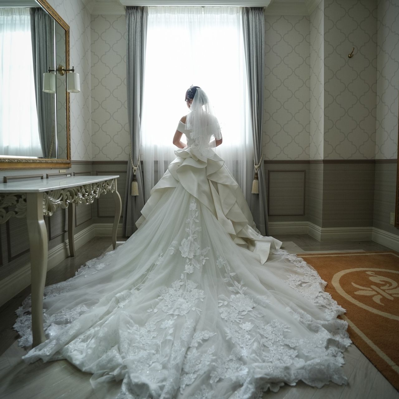 また、トレーンの長さも変えられるので、こちらも挙式と披露宴で変えています。