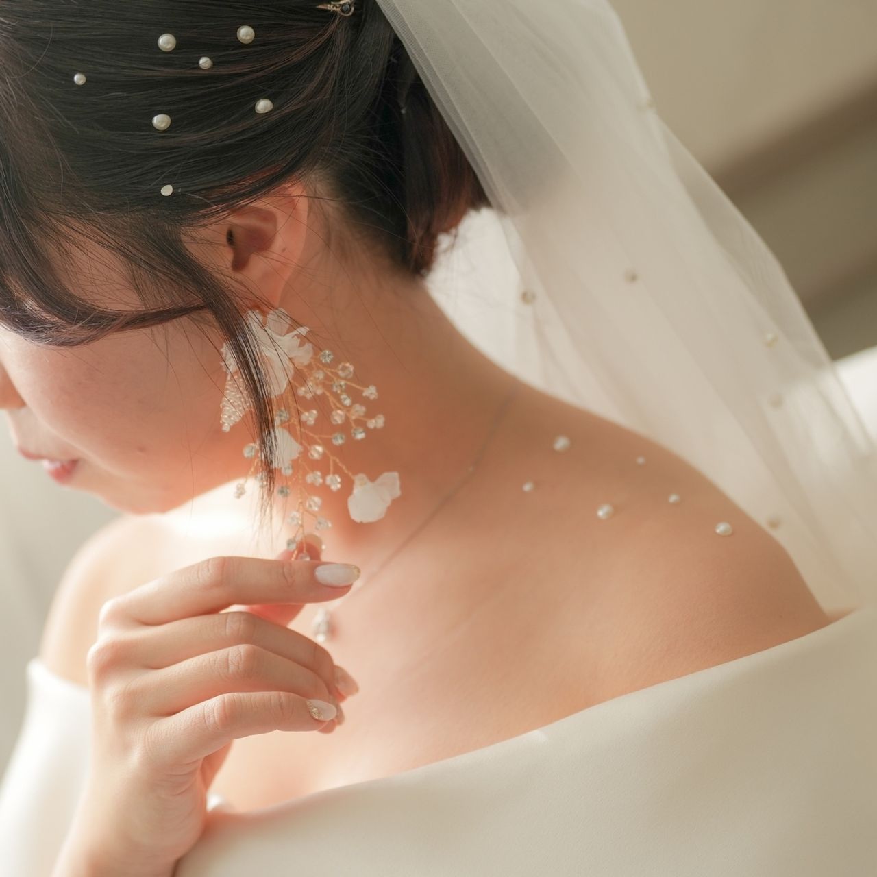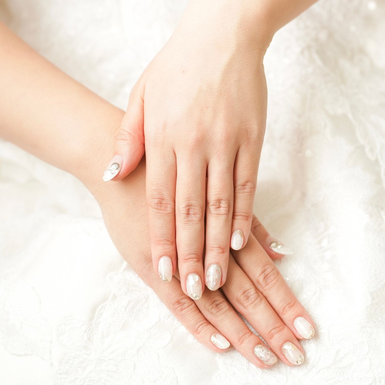 アリエルカラーも迷ったのですが、結婚式といえば純白ということも大事にしたかったのでネイルは白を基調としました。また、シェルなどを使ってもらいそこでアリエル感を出しつつ、挙式にも披露宴にも合うようにしています。