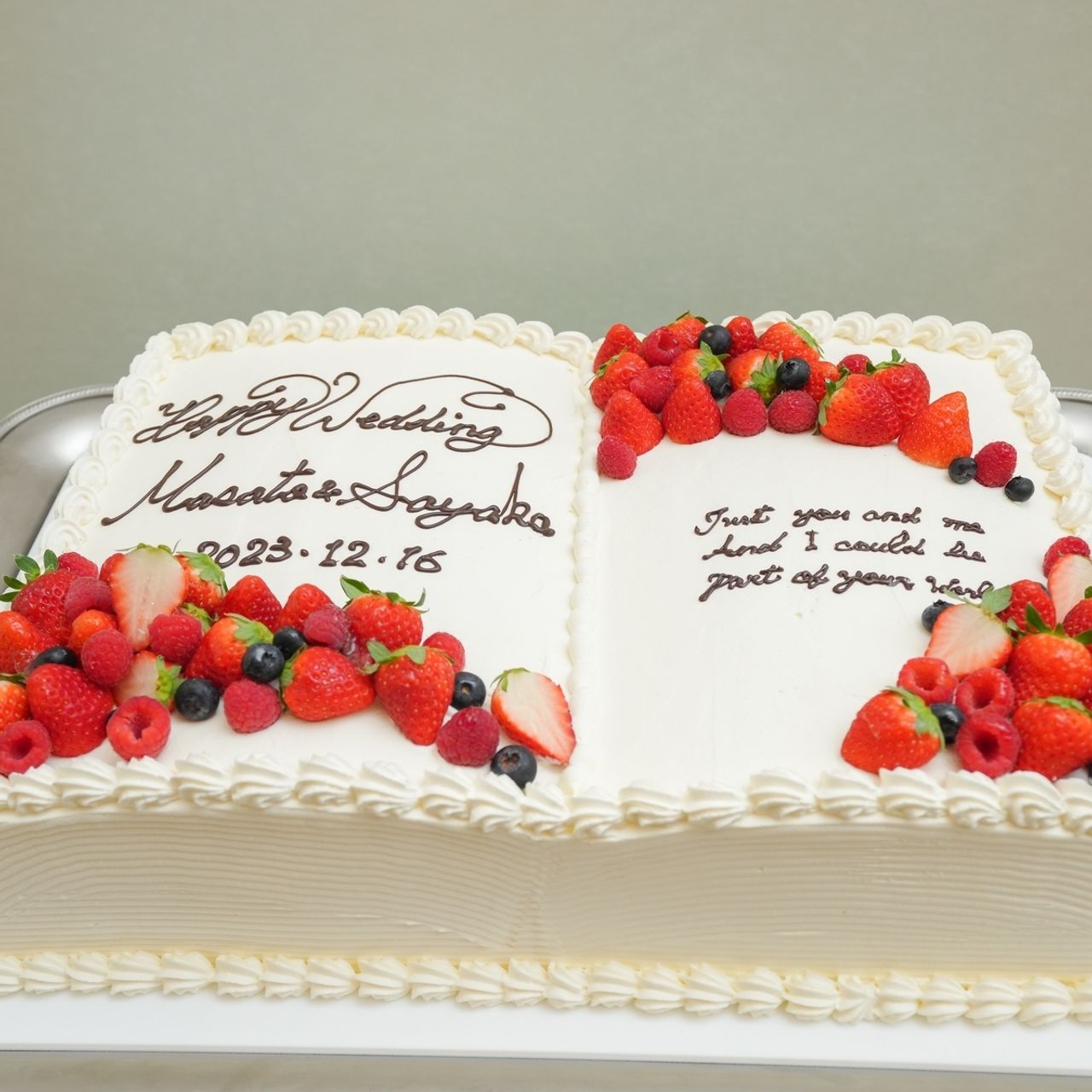 本を開いた形のウェディングケーキにして、アリエルの『パート・オブ・ユア・ワールド』の歌詞の一部を半分に書いてもらいました📕