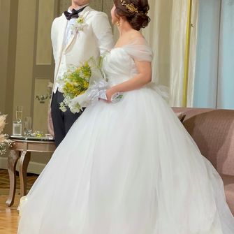 3月婚だったのでミモザの花を使いたく、ドライミモザを中心にしてコーディネートしました。