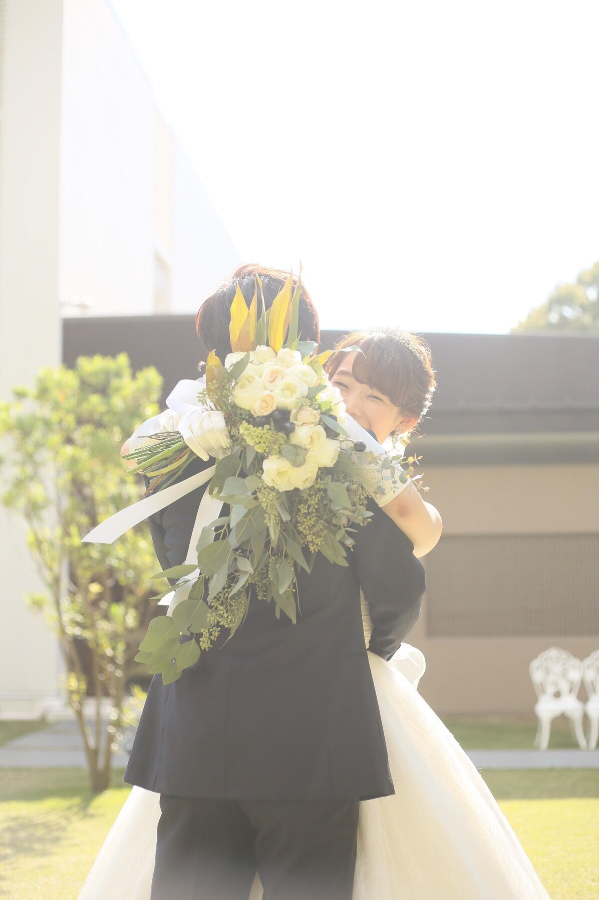 Superflyの「愛を込めて花束を」 の曲で、私の所縁の地を彼が巡って お花を集め、花束を作る というベタなサプライズです。 でも遠距離でしたし 彼も仕事、式の準備で多忙な上 離れてから10年以上帰っていない幼少期を過ごした土地まで足を運んでくれており、結婚式を控えて振り返ることも多かった思い出の地に彼が居て涙が止まりませんでした。知らず識らずのうちに私の友達や母に連絡をとり進めてくれていました。 そして花束を持って登場した彼、 ラナンキュラスが好きなのですが、当日の日程はラナンキュラスが咲いてなかったので造花にもブーケにも使うのは諦めていました。 しかし、彼が抱えてきたのはラナンキュラスの花束でした。 ホテル到着後、ラッピングされ、パッケージングされたDVDがあり、NG集まで作成されていました